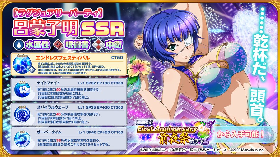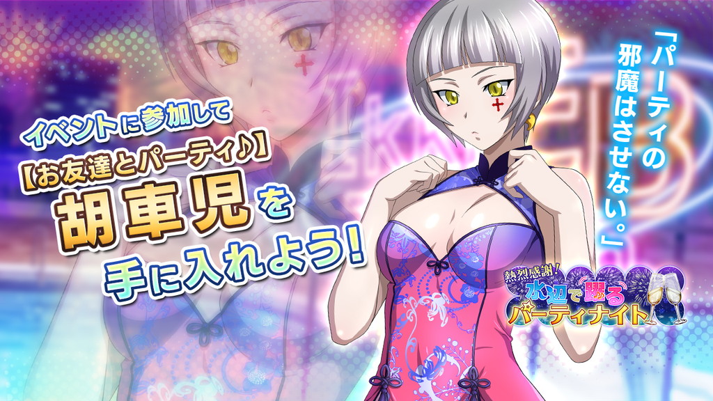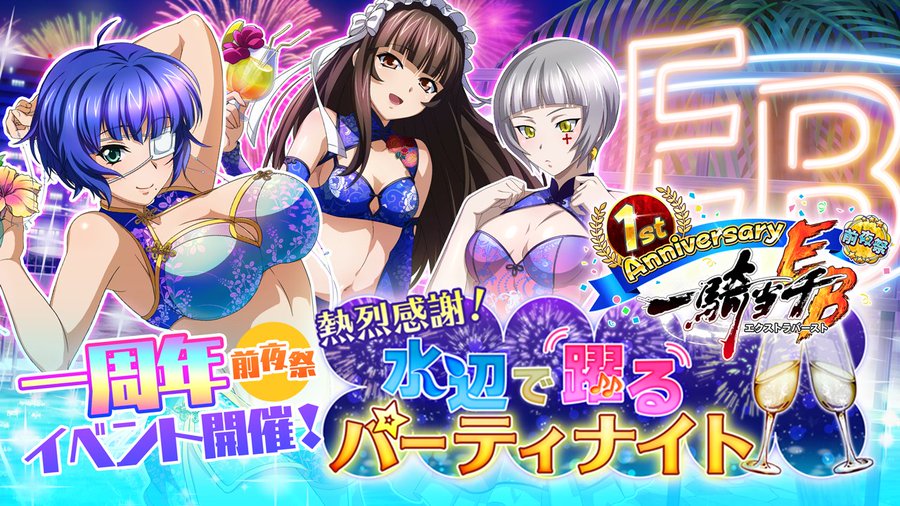 『一騎当千エクストラバースト(えくばと)』にて、2021年5月12日(水)メンテナンス後より、サービス開始1周年の前夜祭として、シナリオイベント「熱烈感謝!水辺で躍るパーティナイト」が開催されました。