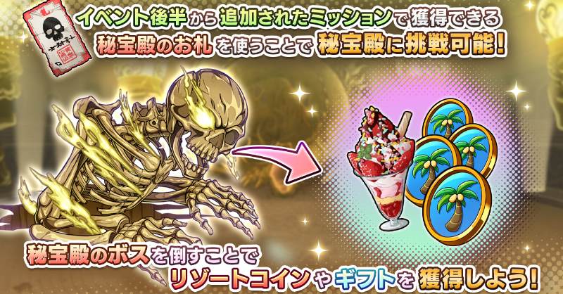 本クエストでは、「秘宝殿のボス」を倒すと、「リゾートコイン」、氣力、ギフトなどを獲得できます。なお、「秘宝殿のお札」はデイリーミッションなどで獲得可能です。