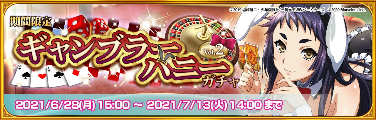 『一騎当千エクストラバースト(えくばと)』にて、本日2021年6月28日(月)15:00より、「ギャンブラーバニーガチャVol.2」が開催されました。