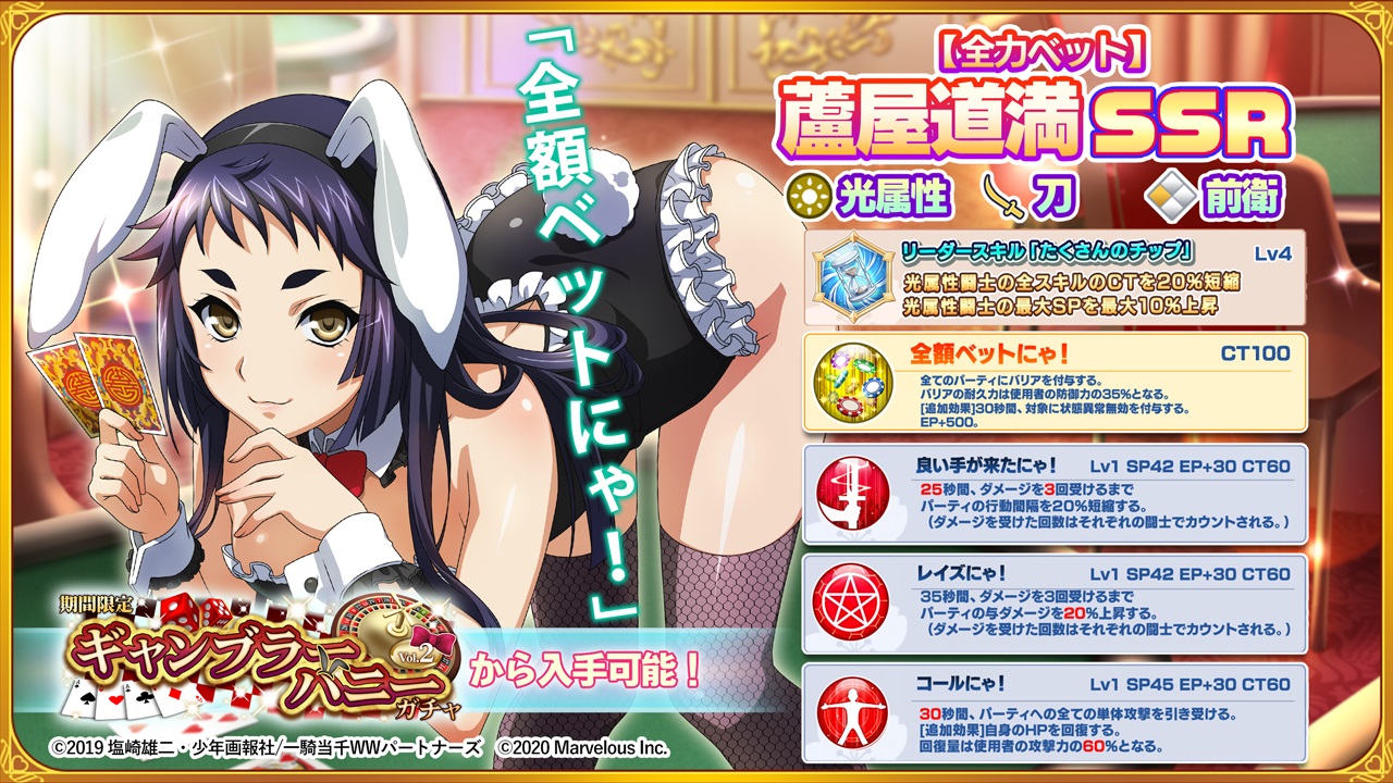 また、イベント「一攫千金!?夢のミリオンランドにゃ」で「【全力ベット】蘆屋道満」をパーティに編成すると、イベントアイテム「バニーコイン」「ミリオンチップ」「【バニー】銀のアイテムガチャ券」の獲得数アップや、イベントボス「アルミラージ」へのダメージアップの特効効果を発揮します。