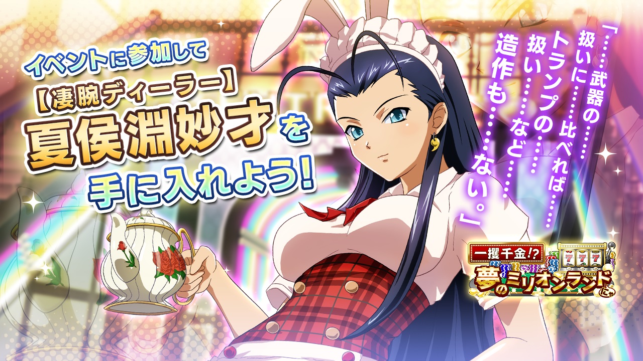 本イベントでは、バニーガール姿の闘士たちが登場する限定シナリオを楽しめるほか、シナリオクエストのクリアで限定SR闘士「【凄腕ディーラー】夏侯淵妙才」を獲得できます。