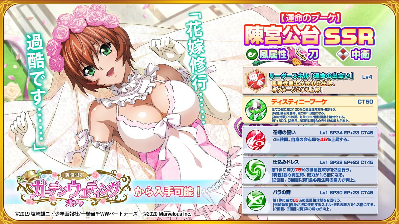 また、イベント「花嫁争奪!?運命のブーケトス」で「【運命のブーケ】陳宮公台」をパーティに編成すると、イベントアイテムの獲得数アップや、イベントボスへのダメージアップの特効効果を発揮します。
