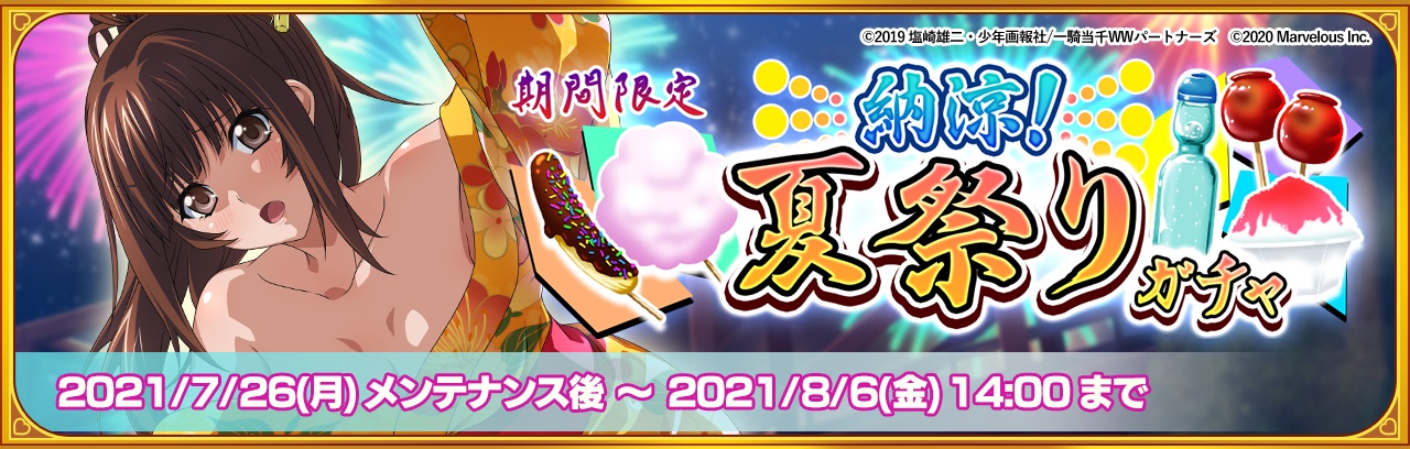 本日7月26日(月)メンテナンス後より、「納涼!夏祭りガチャVol.1」が開催中です。