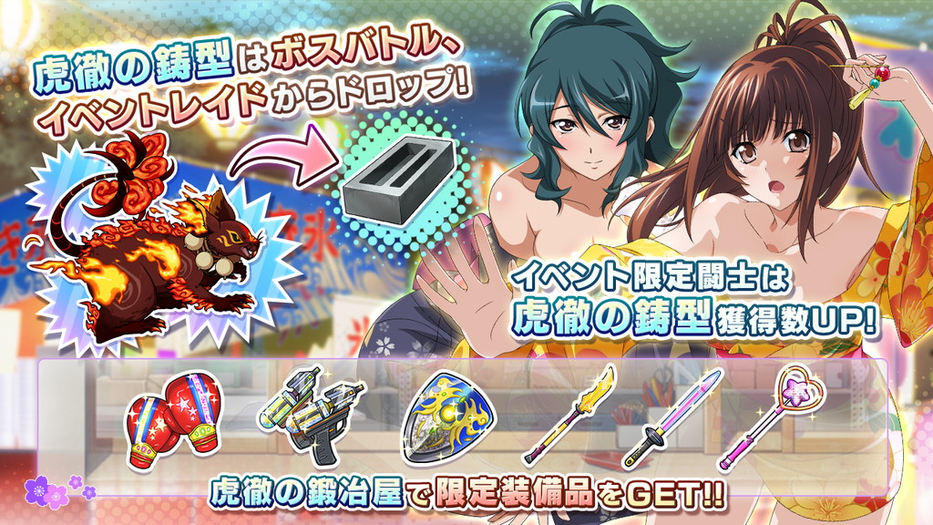 さらに、縁日クエスト、ボスバトル、イベントレイドでドロップする「虎徹の鋳型」で限定装備を獲得できるガチャ「虎徹の鍛冶屋」を引くことが可能です。