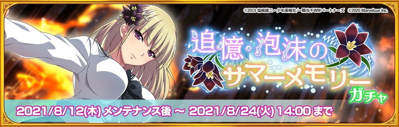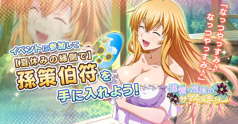 『一騎当千エクストラバースト(えくばと)』にて、本日2021年8月12日(木)メンテナンス後より、「追憶・泡沫のサマーメモリーガチャ」や、シナリオイベント「追憶・泡沫のサマーメモリー」などが開催中です。