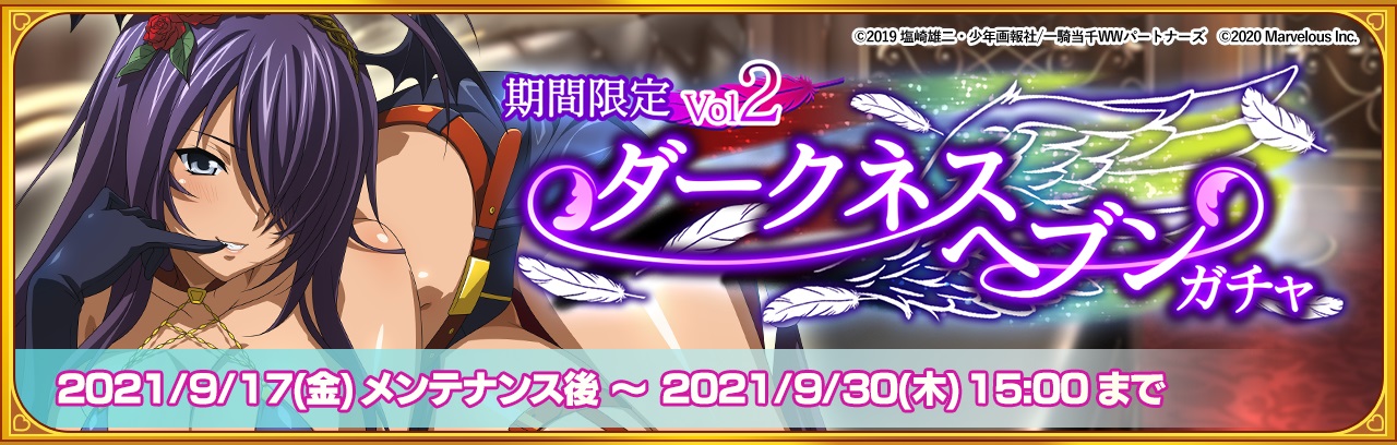 『一騎当千エクストラバースト(えくばと)』にて、本日2021年9月17日(金)メンテナンス後より、「ダークネスヘブンガチャVol.2」が開催されました。