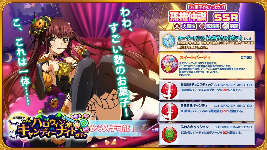 また、イベント「お菓子頂戴♪Trick or Treat!!」で「【お菓子がいっぱい】孫権仲謀」をパーティに編成すると、イベントアイテムの獲得数アップ、イベントボス戦、Trick or Treatクエストでの与ダメージアップの特効効果を発揮します。