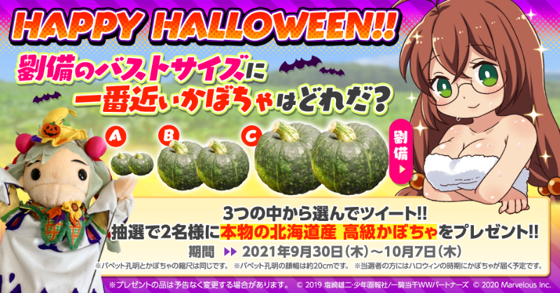 本キャンペーンでは、対象ツイートをRTしたのち、対象ツイートの選択肢から正解だと思うものをツイートすると、抽選で2名に本物の北海道産の高級かぼちゃがプレゼントされます。