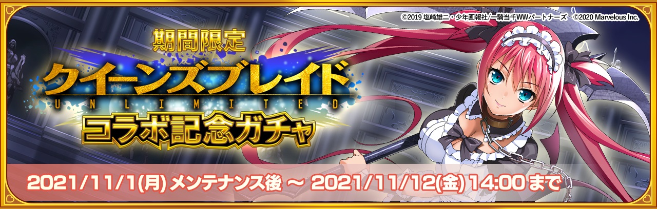 本日11月1日(月)メンテナンス後より、「クイーンズブレイドUNLIMITEDコラボ記念ガチャVol.1」が開催中です。