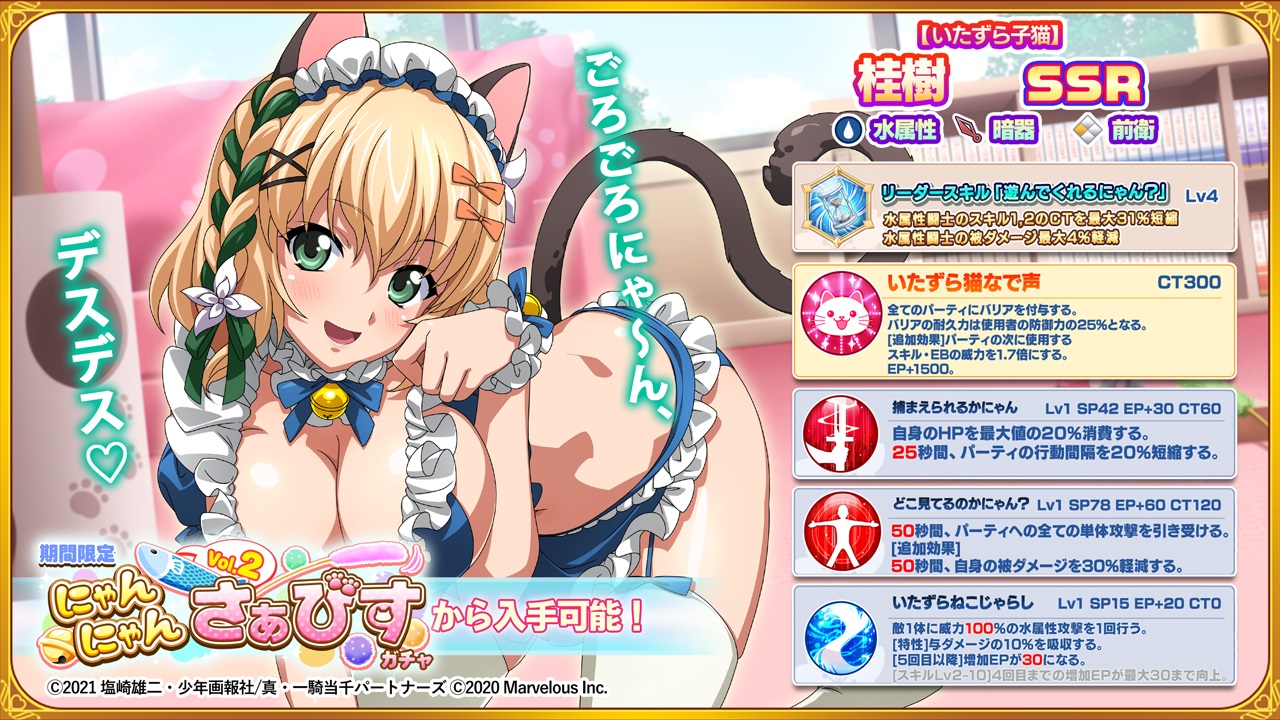 また、イベント「秘密の楽園!?にゃんにゃんパラダイス」にて、「【いたずら子猫】桂樹」をパーティに編成すると、イベントアイテムの獲得数アップや、イベントボスへの与ダメージアップの特効効果を発揮します。