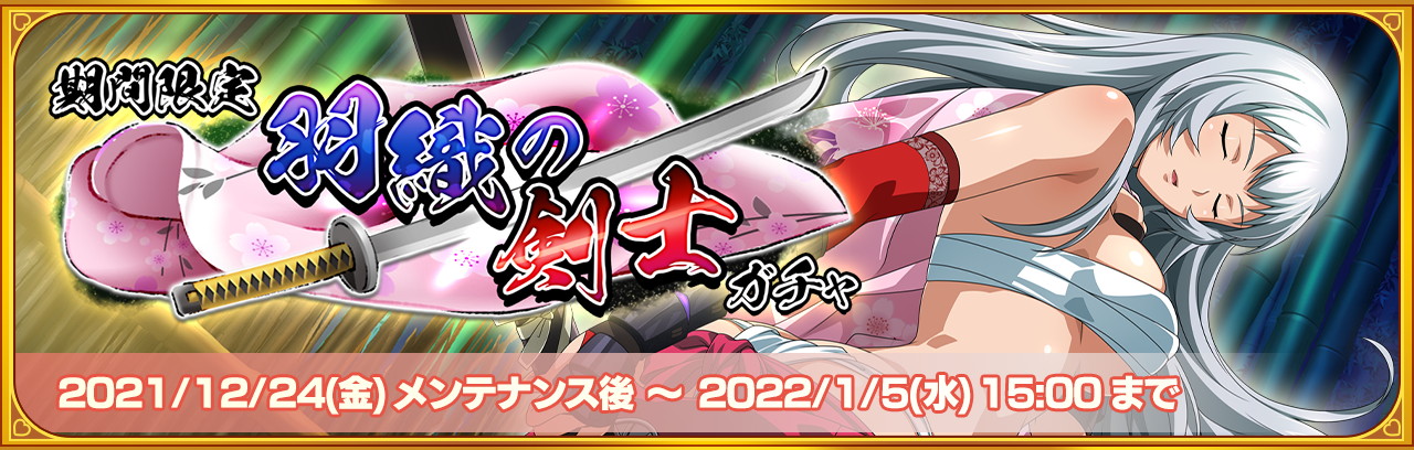 『一騎当千エクストラバースト(えくばと)』にて、本日2021年12月24日(金)メンテナンス後より、SSR闘士の排出率が龍玉ガチャの1.5倍のバーストフェス「羽織の剣士」ガチャが開催中です。
