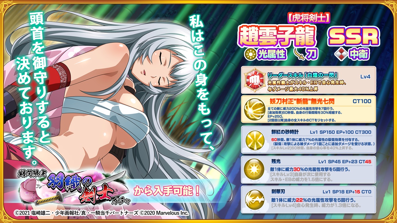 また、レイドイベントに「【虎将剣士】趙雲子龍」を編成することでイベントアイテム「剣豪の眼帯」の獲得数アップや、レイドボス「柳生三厳」への与ダメージアップの特効効果を発揮します。