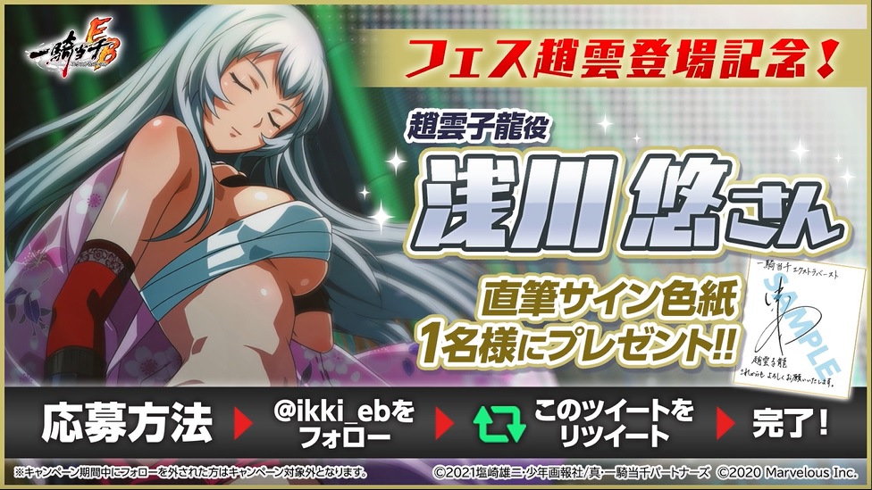 本キャンペーンでは、公式Twitterアカウント(@ikki_eb)をフォローし、対象ツイートをRTすると、抽選で1名に「趙雲子龍」役である浅川悠さんの直筆サイン色紙がプレゼントされます。
