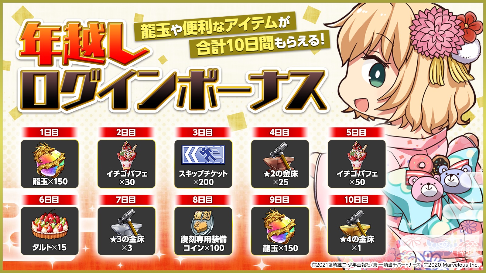 本ログインボーナスでは、10日間のログインで龍玉や、「イチゴパフェ」「タルト」「スキップチケット」などを獲得できます。