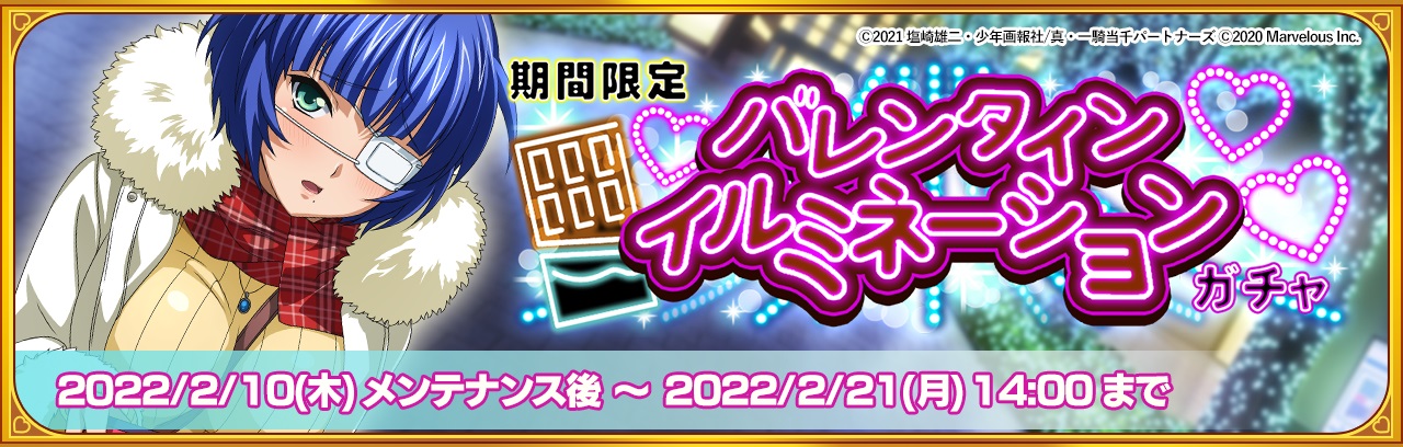 本日2月10日(木)メンテナンス後より、「バレンタインイルミネーションガチャVol.1」が開催中です。