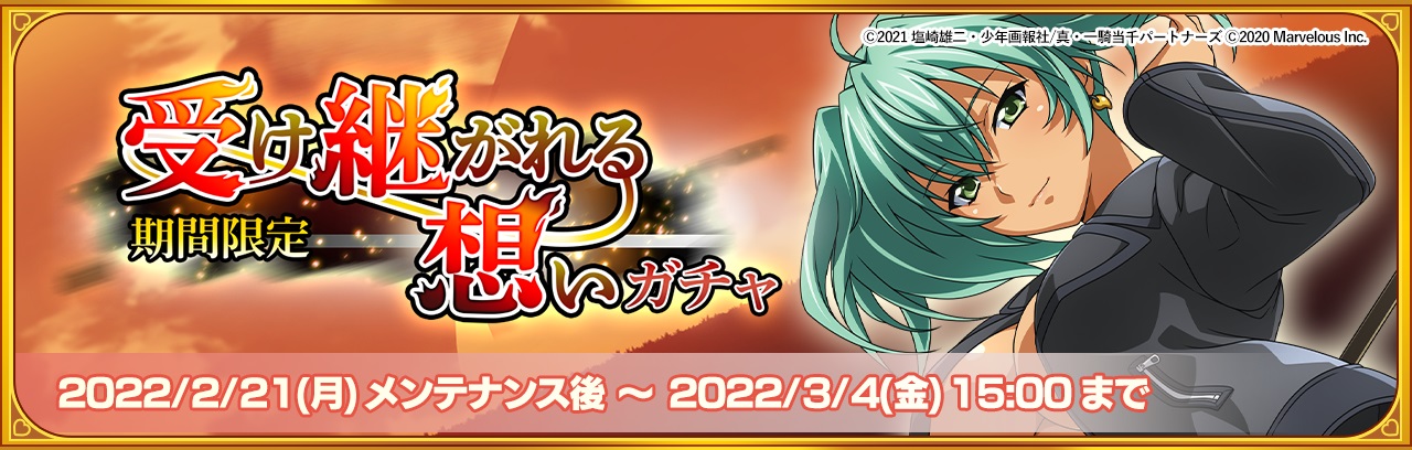 『一騎当千エクストラバースト(えくばと)』にて、本日2022年2月21日(月)メンテナンス後より、SSR闘士の排出率が龍玉ガチャの1.5倍のバーストフェス「受け継がれる想い」ガチャが開催中です。