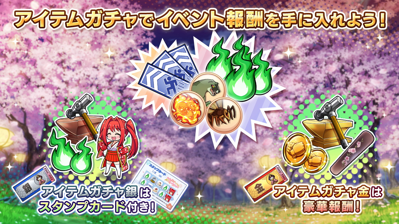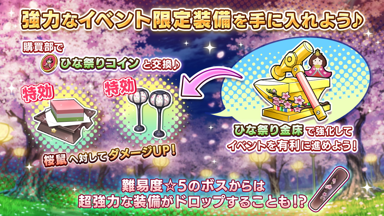 さらに、「【ひな祭り】金のアイテムガチャ券」「【ひな祭り】銀のアイテムガチャ券」「ひな祭りコイン」を集めると、限定装備品「華の木笏」「ひし餅」「ぼんぼりセット」、各種強化素材などを獲得可能です。