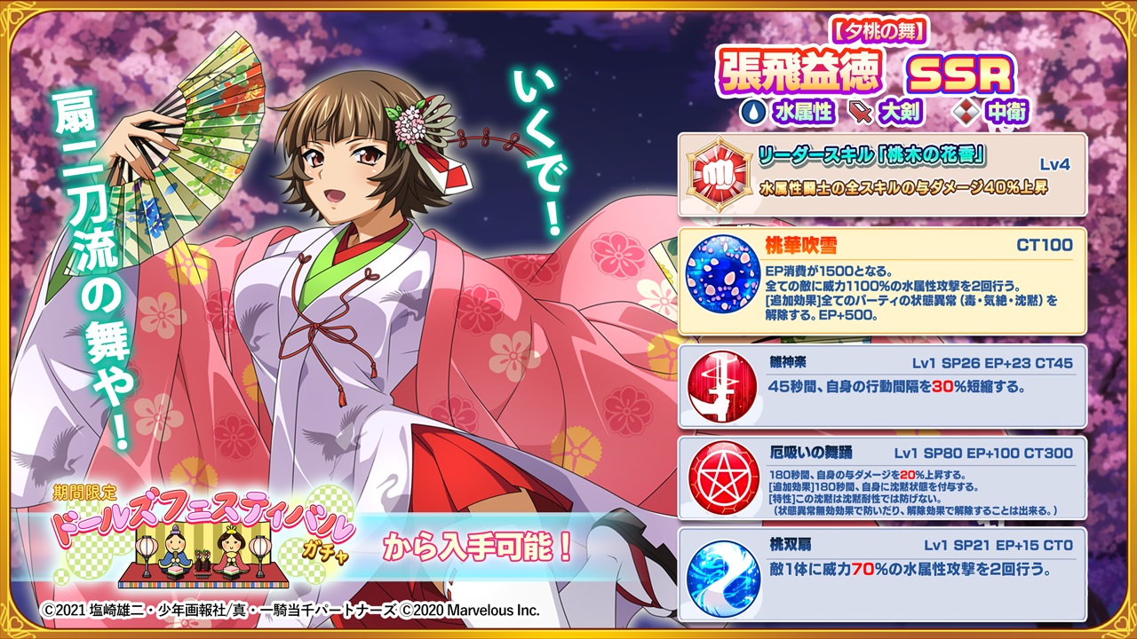また、イベント「女の子の園 ピーチガーデン」で「【夕桃の舞】張飛益徳」をパーティに編成すると、イベントアイテムの獲得数アップや、イベントボスおよびひな祭りクエストでの与ダメージアップ、ひな祭りクエストでの被ダメージダウンの特効効果を発揮します。