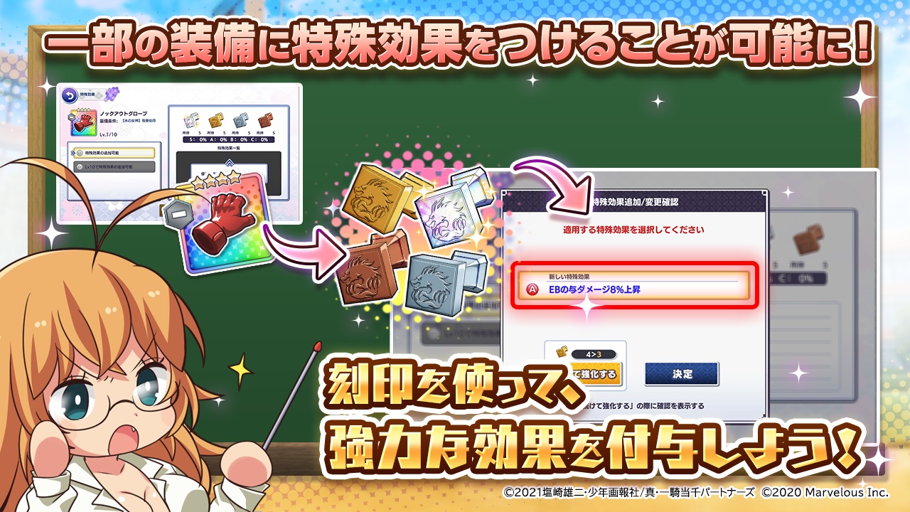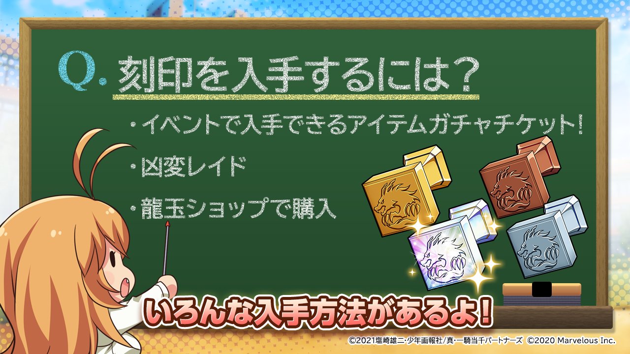 アイテムガチャ、凶変レイドなどで入手できる刻印を使用すると、スキル・EBのCT短縮やHP・攻撃力・会心率・各種耐性のステータス上昇などの特殊効果をランダムで付与できます。