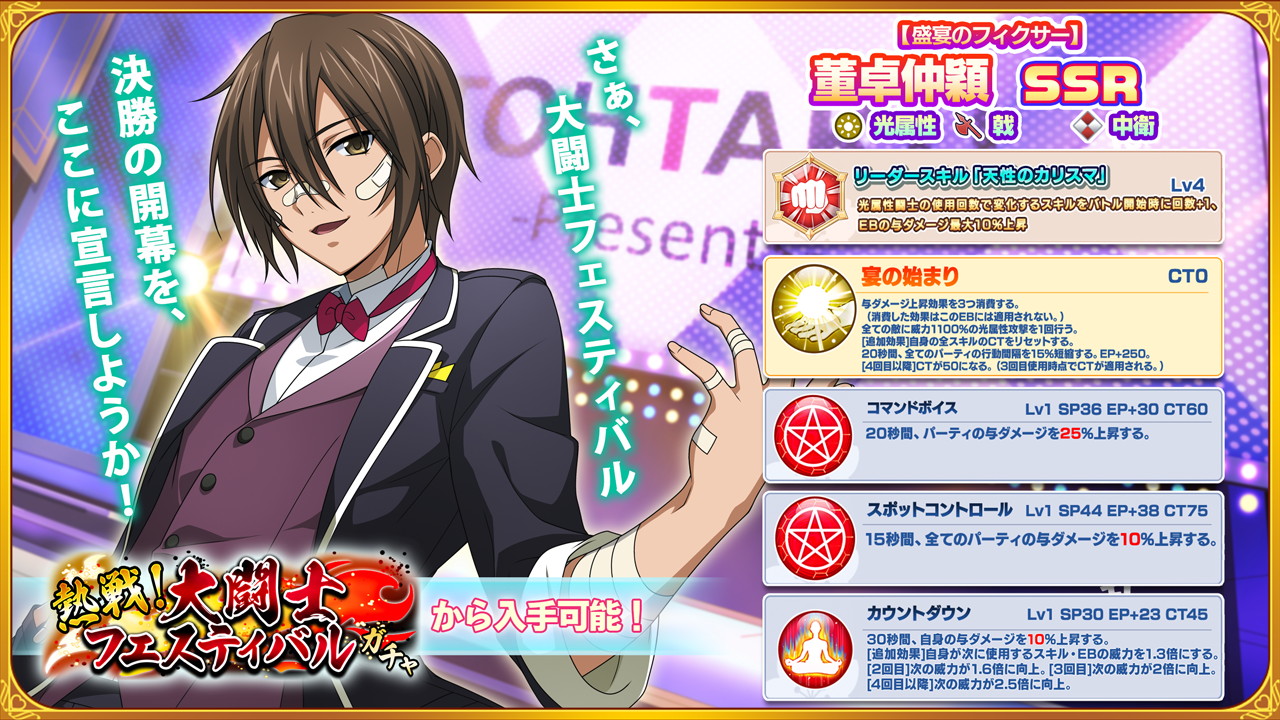 本ガチャでは、新登場の限定SSR闘士「【盛宴のフィクサー】董卓仲穎」や、過去に登場した限定SSR闘士がピックアップされ、同レアリティの他闘士よりも排出率がアップしています。
