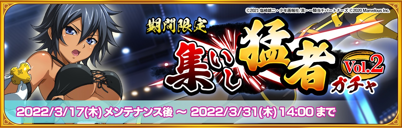 『一騎当千エクストラバースト(えくばと)』にて、2022年3月17日(木)メンテナンス後より、「集いし猛者ガチャVol.1」が開催中です。