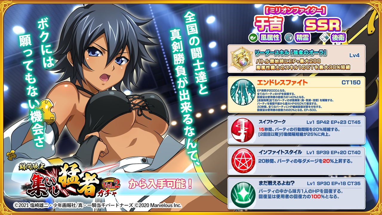 本ガチャでは、新登場の限定SSR闘士「【ミリオンファイター】于吉」や、過去に登場した限定SSR闘士がピックアップされ、同レアリティの他闘士よりも排出率がアップしています。