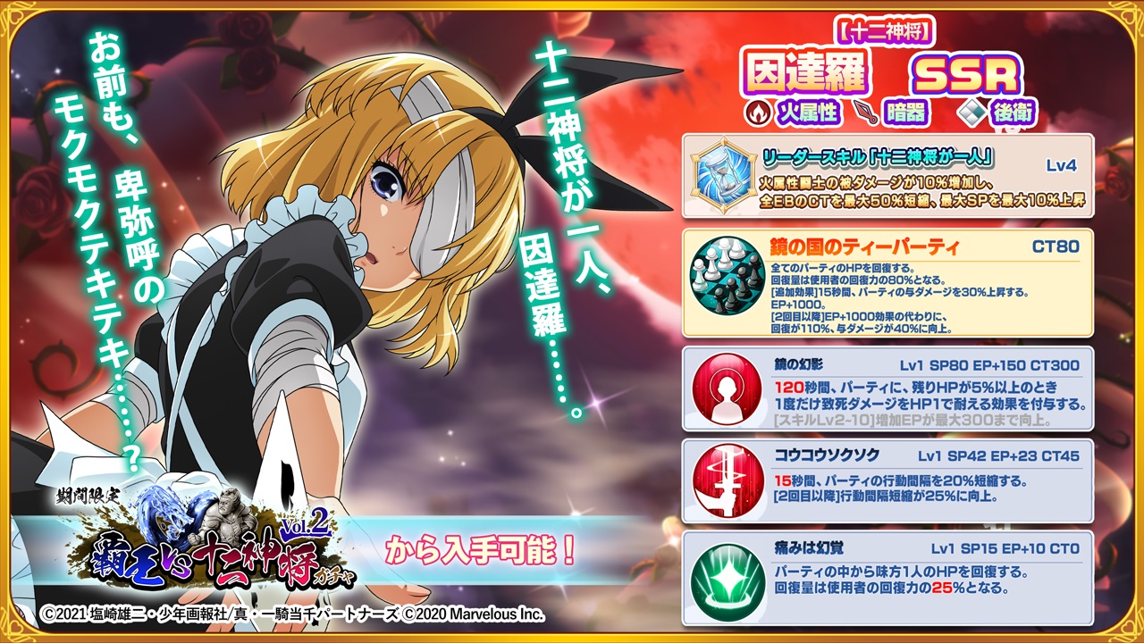 また、イベント「新たな水龍の覚醒!真・一騎当千」で「【十二神将】因達羅」をパーティに編成すると、イベントアイテムの獲得数アップや、イベントボス戦での与ダメージアップおよび被ダメージダウンの特効効果を発揮します。