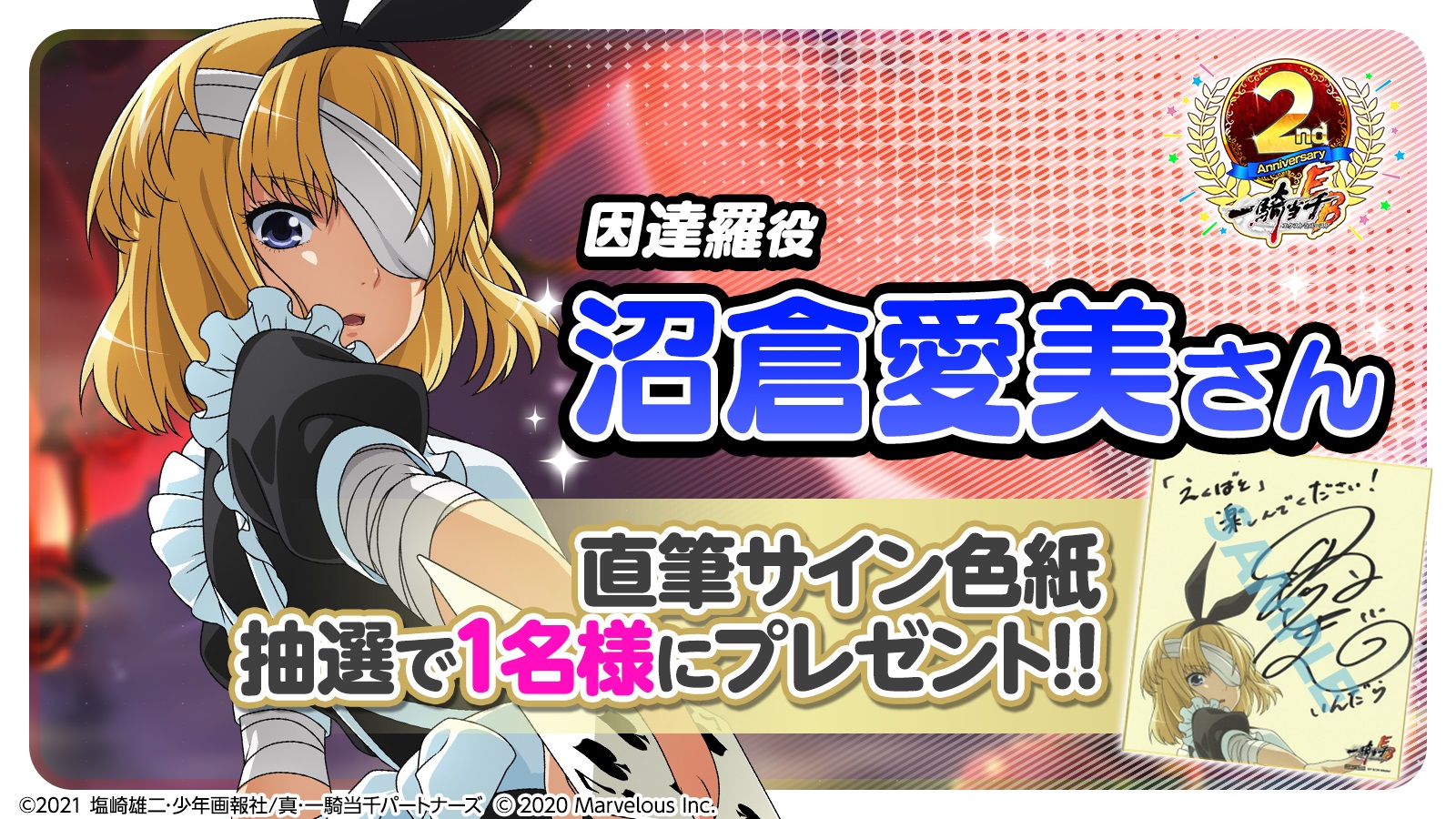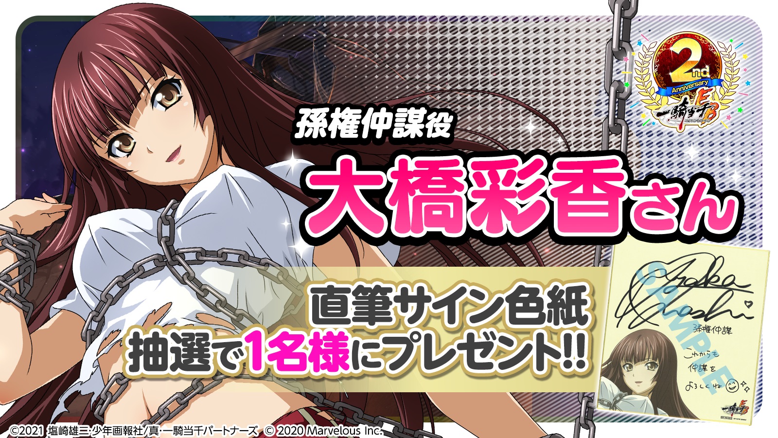 本キャンペーンでは、公式Twitterをフォローし、各対象ツイートをRTすると、抽選で各1名に「孫権仲謀」役である大橋彩香さん、「因達羅」役である沼倉愛美さんの直筆サイン色紙がプレゼントされます。