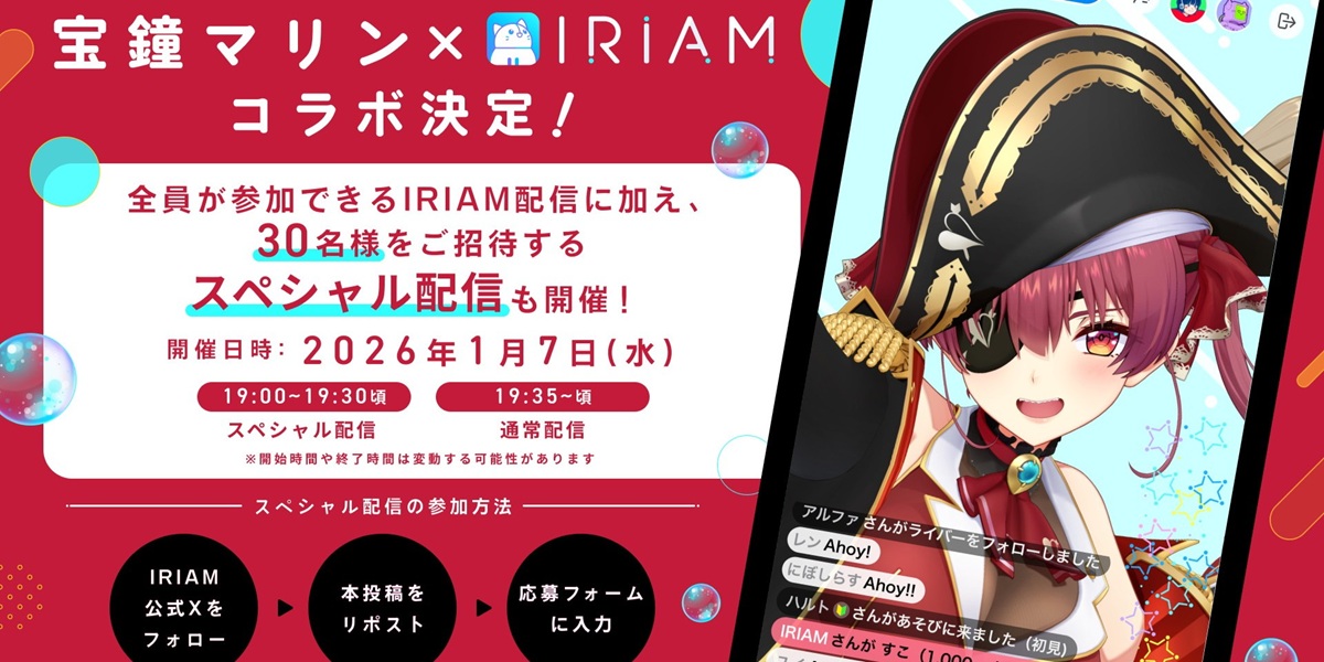 今回のコラボでは、2025年1月7日(水)に宝鐘マリンさんがIRIAMでライブ配信を実施します。IRIAMユーザー全員が参加できる通常配信、抽選に当選した30名が招待されるスペシャル配信が開催予定です。
