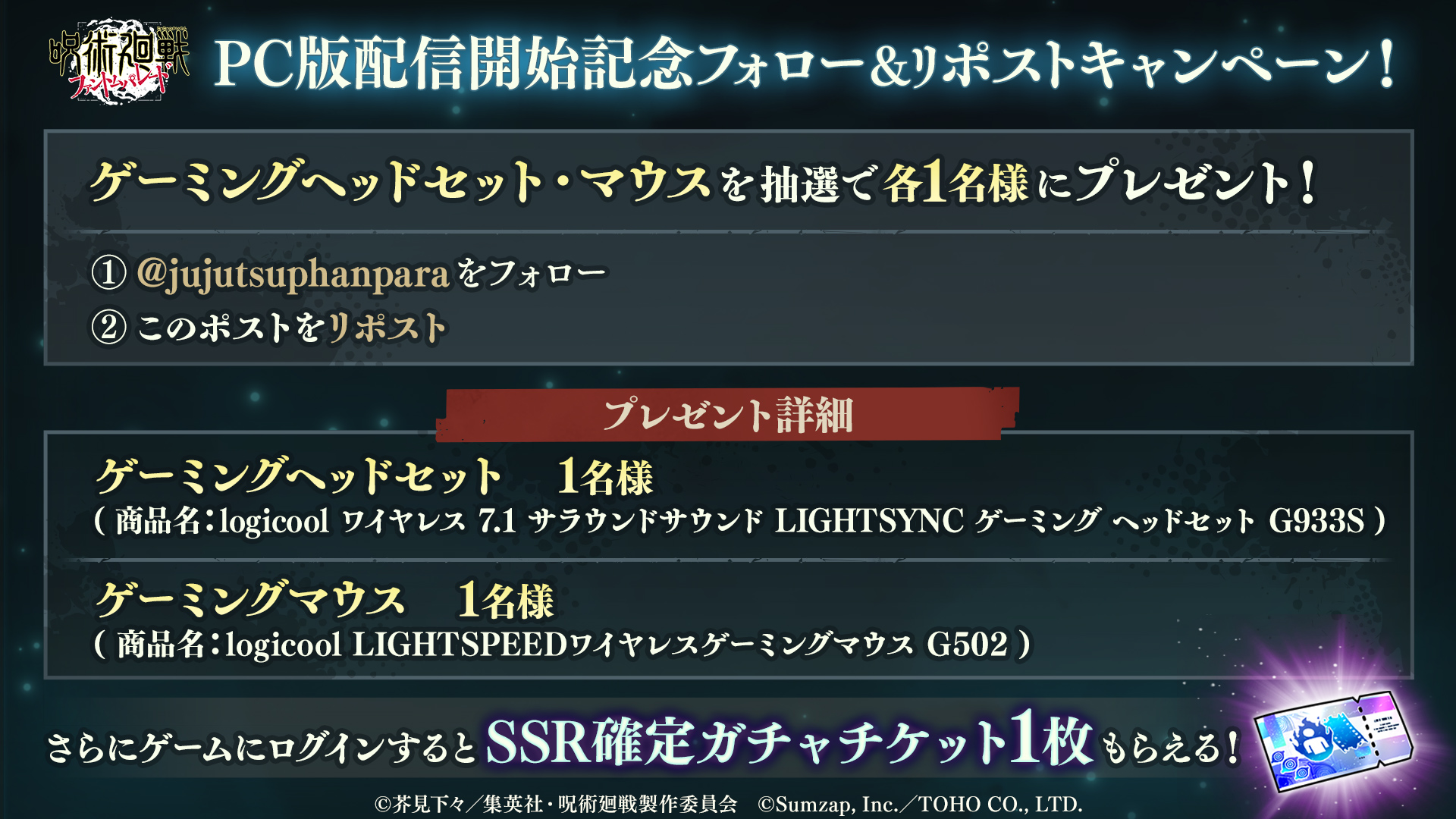 本キャンペーンでは、公式X(旧:Twitter)アカウント(@jujutsuphanpara)をフォローし、対象ポストをリポストすると、抽選で各1名にゲーミングヘッドセット、ゲーミングマウスがプレゼントされます。