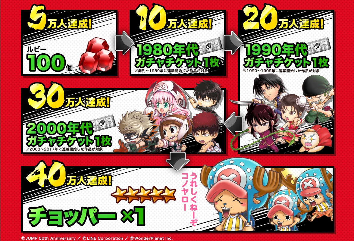 2018年春の配信に先駆け、本日2月5日(月)より『ジャンプチ ヒーローズ』の事前登録が開始されました。事前登録者数に応じて、歴代ジャンプキャラクターが登場するガチャを引くことができる「ガチャチケット」や、「ONE PIECE」のキャラクター「★5 チョッパー」、「ルビー100個」がプレゼントされます。「ルビー」はゲーム内でガチャを引いたり、コンティニューなどに使用できるアイテムです。