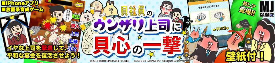 エムジェイガレイジ株式会社は、TOHOシネマズ株式会社と、株式会社ディー・エル・イーの協力を得て、TOHOシネマズでおなじみの人気キャラクター「貝社員」の新作iPhoneアプリ『貝社員のウンザリ上司に貝心の一撃』の配信を2016年2月9日(火)に開始しました。