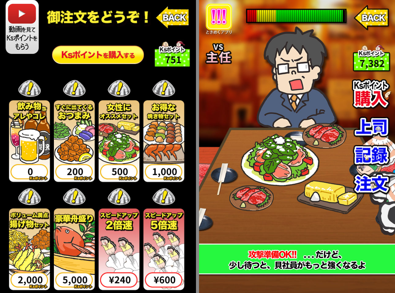 料理を注文し、貝社員を登場させ、登場した貝社員を上司にぶつけ、イヤ〜な上司を撃退し、平和で楽しい「僕らの飲み会」を復活させましょう。