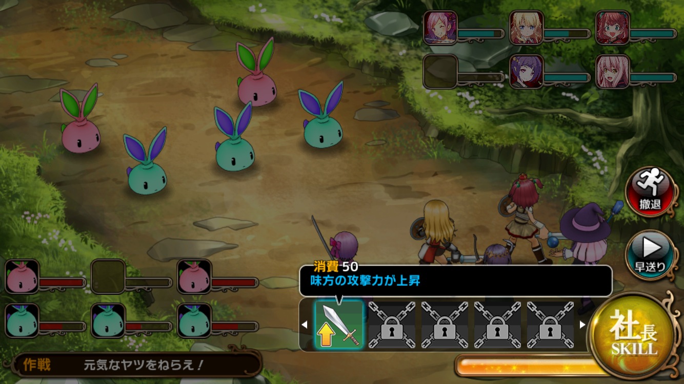 戦闘では、社員それぞれが自分自身の「作戦」に従って、オートで敵を選んで攻撃します。「作戦」は「元気なやつを狙え!」や「遠距離攻撃を止めろ!」など様々で、これによっては敵を効率よく倒すこともありますし、「そいつじゃなくてアイツを攻撃しろよ!」となってしまう場面も...。