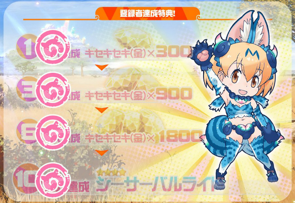\事前登録者数10万人達成!/おかげさまで事前登録者数10万人を達成したため、キセキセキ金3000個と、シーサーバル・ライトのプレゼントが決定しました!ご登録してくださったみなさま、ありがとうございます!#けもフェス #けものフレンズ pic.twitter.com/Mzhr9LIz1u— 【公式】けものフレンズ FESTIVAL (@kemono_festival) May 30, 2018