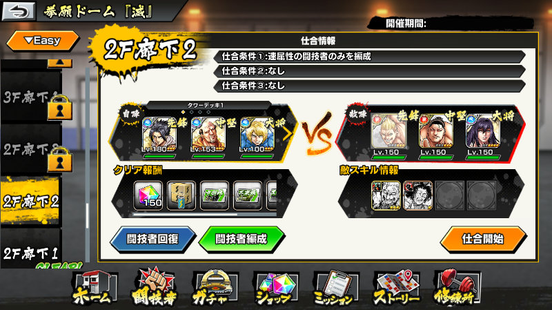 各バトルには、さまざまな条件が設定されおり、条件を満たしながら勝ち進む必要があります。また、バトルで受けたダメージはそのまま次のバトルに引き継がれ、一度戦闘不能になった闘技者は以降使用することができなくなるため、できるだけ多くの闘技者を成長させておくことが攻略のカギとなります。なお、「拳願ドーム」を攻略すると豪華報酬を獲得できます。