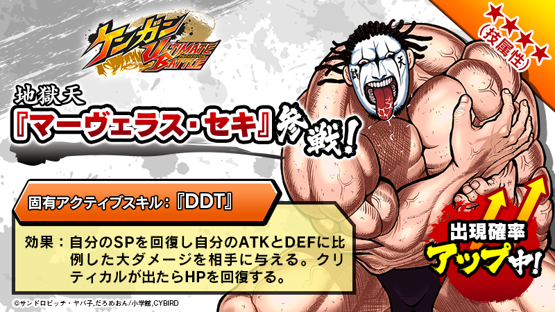 「マーヴェラス・セキ」は、技属性の闘技者で、自分のSPを回復し自分のATKとDEFに比例した大ダメージを与え、さらにクリティカルが出ればHPも回復できる固有アクティブスキル「DDT」を持つ強力な闘技者です。