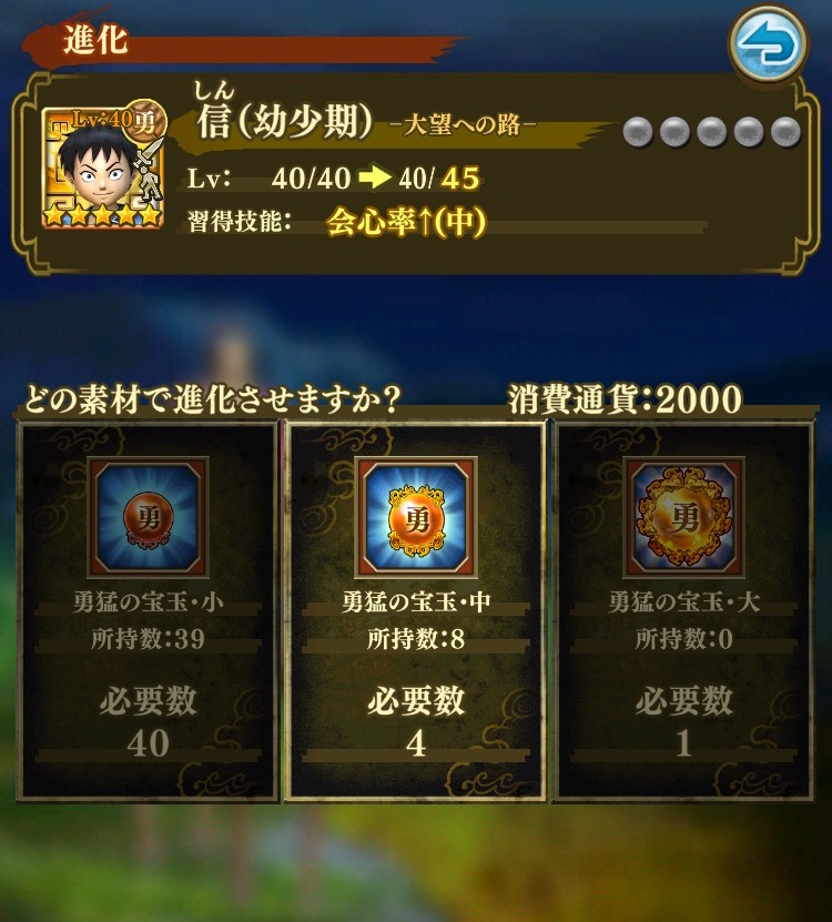 進化素材は属性によって分かれており、それぞれ小/中/大の大きさがあります。すべての大きさの素材が必要なわけではなく、どれかの大きさで必要数に達していれば「進化」できます。例えば画像のように☆5「信(幼少期)」なら、大:1個/中:4個/小:40個の、どれかが足りていればOKということですね。