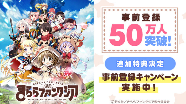 株式会社芳文社、株式会社アニプレックス、株式会社ドリコムは共同で、芳文社「まんがタイムきらら」の作家陣が描く、マンガのキャラクター&ゲームのオリジナルキャラクターが多数登場するスマートフォンゲーム『きららファンタジア』の事前登録数が50万人を突破したことを発表しました。