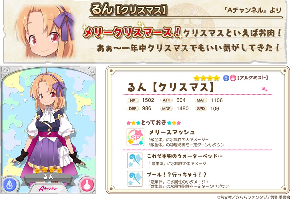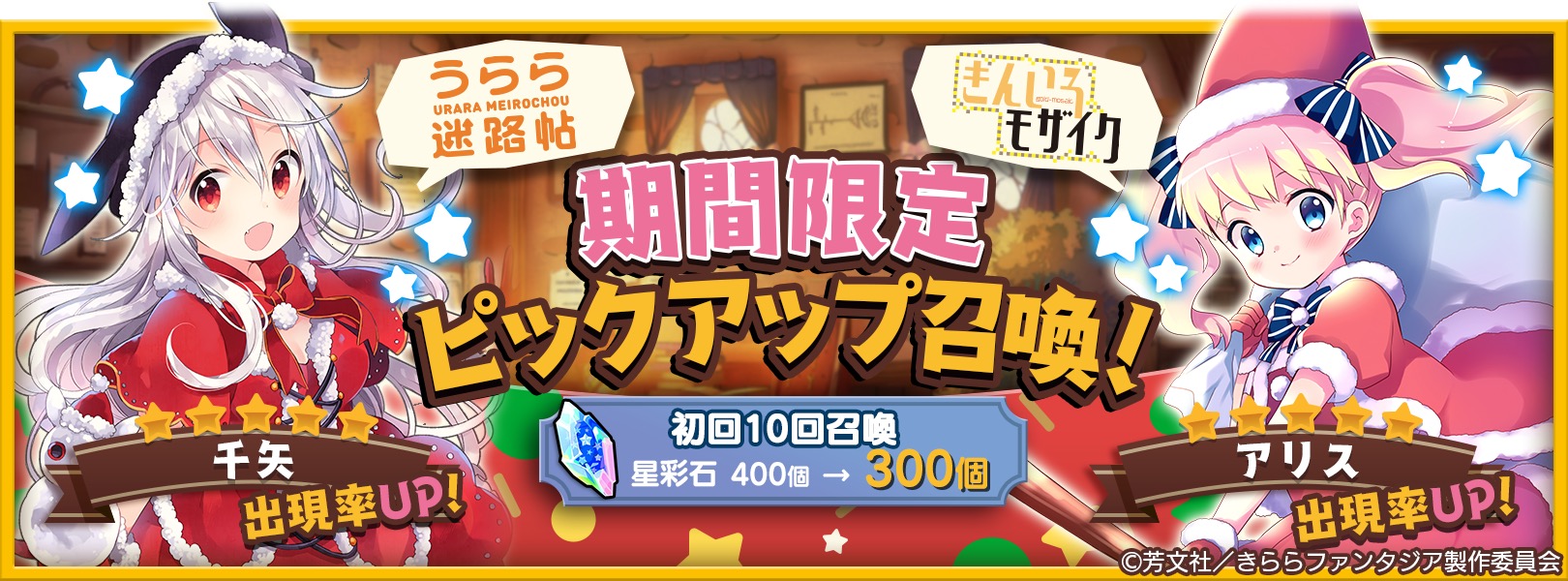 クリスマス衣装の「きんいろモザイク」アリス、「うらら迷路帖」千矢、「Aチャンネル」るんが期間限定で登場します。
