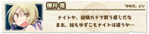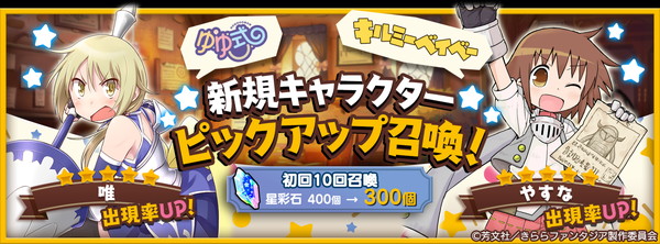 さらに、同じく「キルミーベイベー」より「ソーニャ(CV:田村睦心)」、「ゆゆ式」より新衣装の「櫟井 唯(CV:津田美波)」の出現率がアップされます。