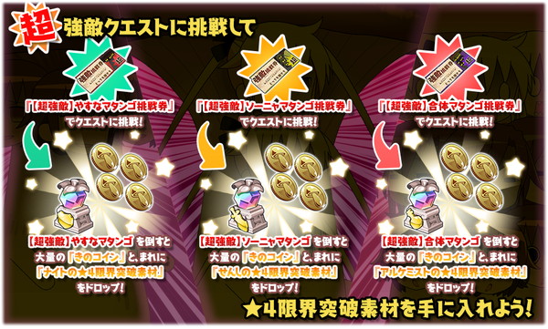 また、「強敵クエスト」をクリアすることで「【超強敵】挑戦券」を手に入れることができます。「超強敵クエスト」に挑戦して「超強敵」を倒すとイベント共通の素材を獲得。さらに、「★4限界突破素材」を入手可能です。