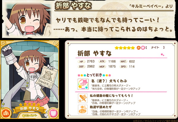 「キルミーベイベー」キャラクターの★5「折部やすな(CV.赤﨑千夏)」と、★4「呉織あぎり(CV.篠田みなみ)」などが登場&出現率がアップされた、「新規キャラクターピックアップ召喚」が開催中です。10連召喚では★4以上のキャラクターが1枚以上確定します。