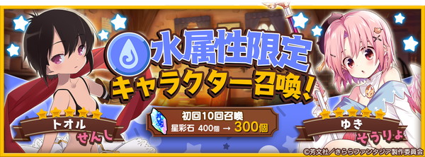 また、水属性のキャラクターのみが出現する「水属性限定キャラクター召喚」も開催中です。