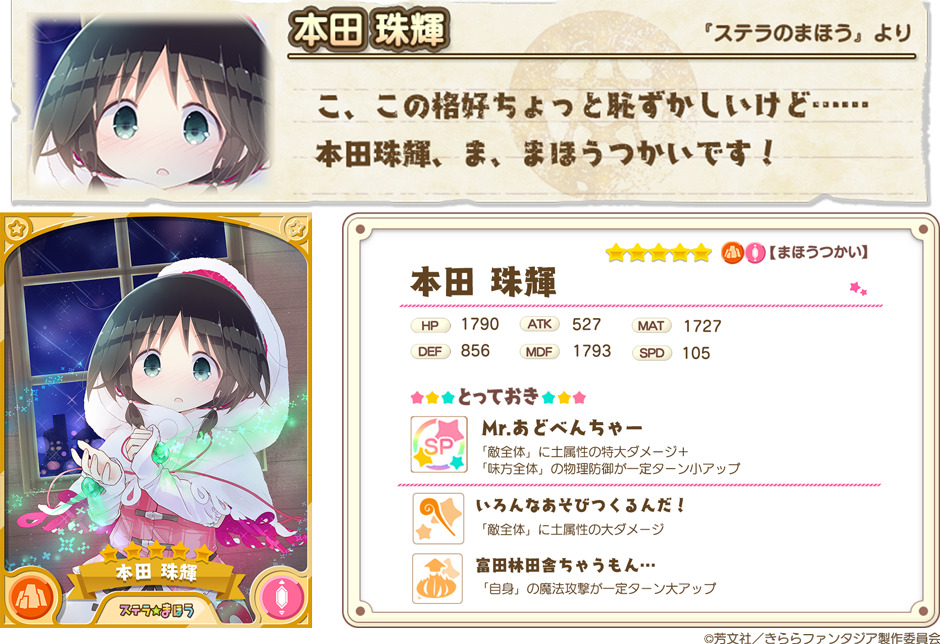 『きららファンタジア』にて、2018年5月18日(金)より、「土属性限定キャラクター召喚」が開催されます。本召喚では、「ソーニャ」「本田珠輝」「折部やすな」など土属性のキャラクターが登場します。