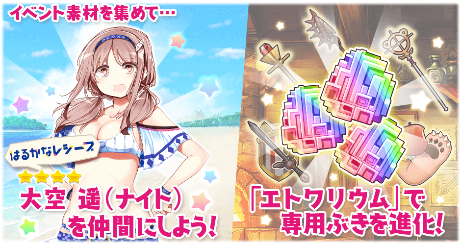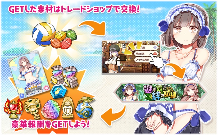 また、本イベントでは、『きららファンタジア』オリジナルストーリーが楽しめるシナリオクエストや収集クエストのほか、豪華報酬を獲得できる「(超強敵)クエスト」、「(極)クエスト」に挑戦可能です。クエストをクリアすると様々な報酬と交換できる、イベント素材「南国の木の実」や「ビーチバレー球」が獲得できます。