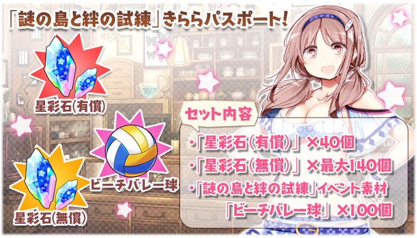 現在、「謎の島と絆の試練」きららパスポートが販売されます。本パスポートを購入すると、イベント限定キャラクター★4「大空 遥」を仲間にするために必要な量の素材「ビーチバレー球」を獲得できるほか、星彩石が獲得可能です。