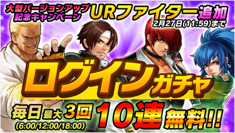 本ガチャでは、毎日3回10連ガチャを無料で引くことができるほか、期間中はURファイターが追加されます。