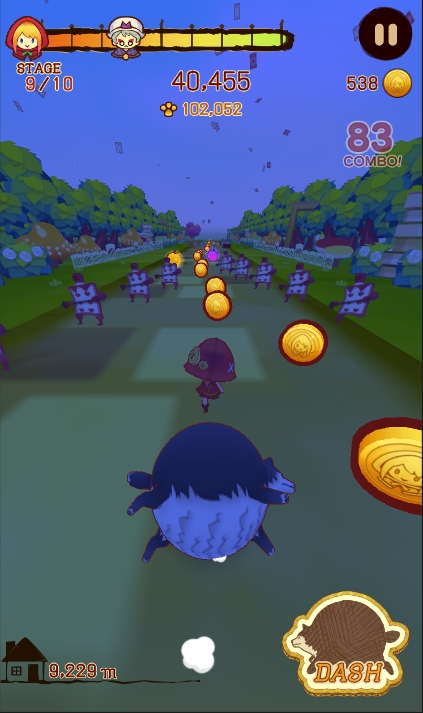 『コロコロオオカミと赤ずきん』は、赤ずきんのチェリルがオオカミさんをコロコロと転がして、家に連れ戻そうとするおばあちゃんから逃げ続けるランゲームです。子供たちに人気の童話“赤ずきん”“不思議の国のアリス”“ヘンゼルとグレーテル”をモチーフにした絵本の中のような世界を舞台に、りんごやコインを集めながらできるだけ遠くまで逃げましょう!
