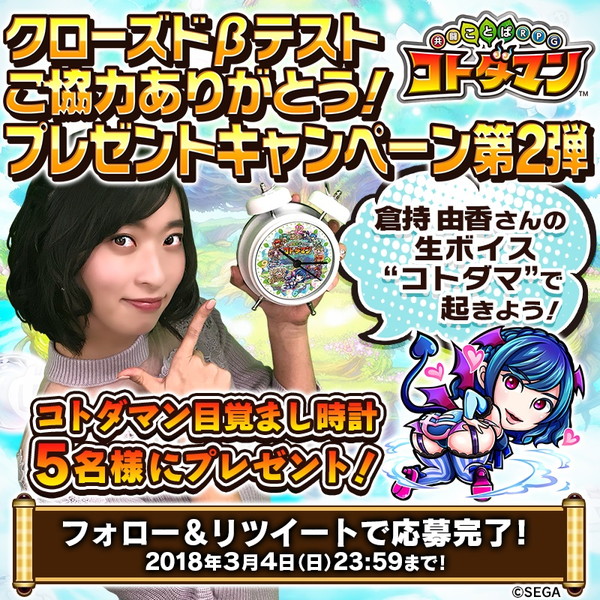 『共闘ことば RPG コトダマン(コトダマン)』は、本日2018年2月26日(月)より、2,000円分のAmazonギフト券や、グラビアアイドル・倉持由香さんの生ボイス入りの目覚まし時計&サイン色紙が当たる、「クローズドβテストご協力ありがとう!キャンペーン」を開催しました。